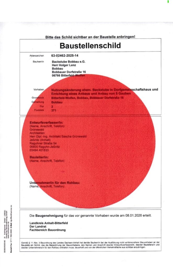 Frohe Nachrichten ereilten uns im Februar 2026 – Die Baugenehmigung für die Begegnungsstätte wurde nunmehr erteilt. Damit können wir die wichtigen Fördermittelanträge einreichen und biegen (zumindest was die Formalitäten betrifft) auf die Zielgerade ein.